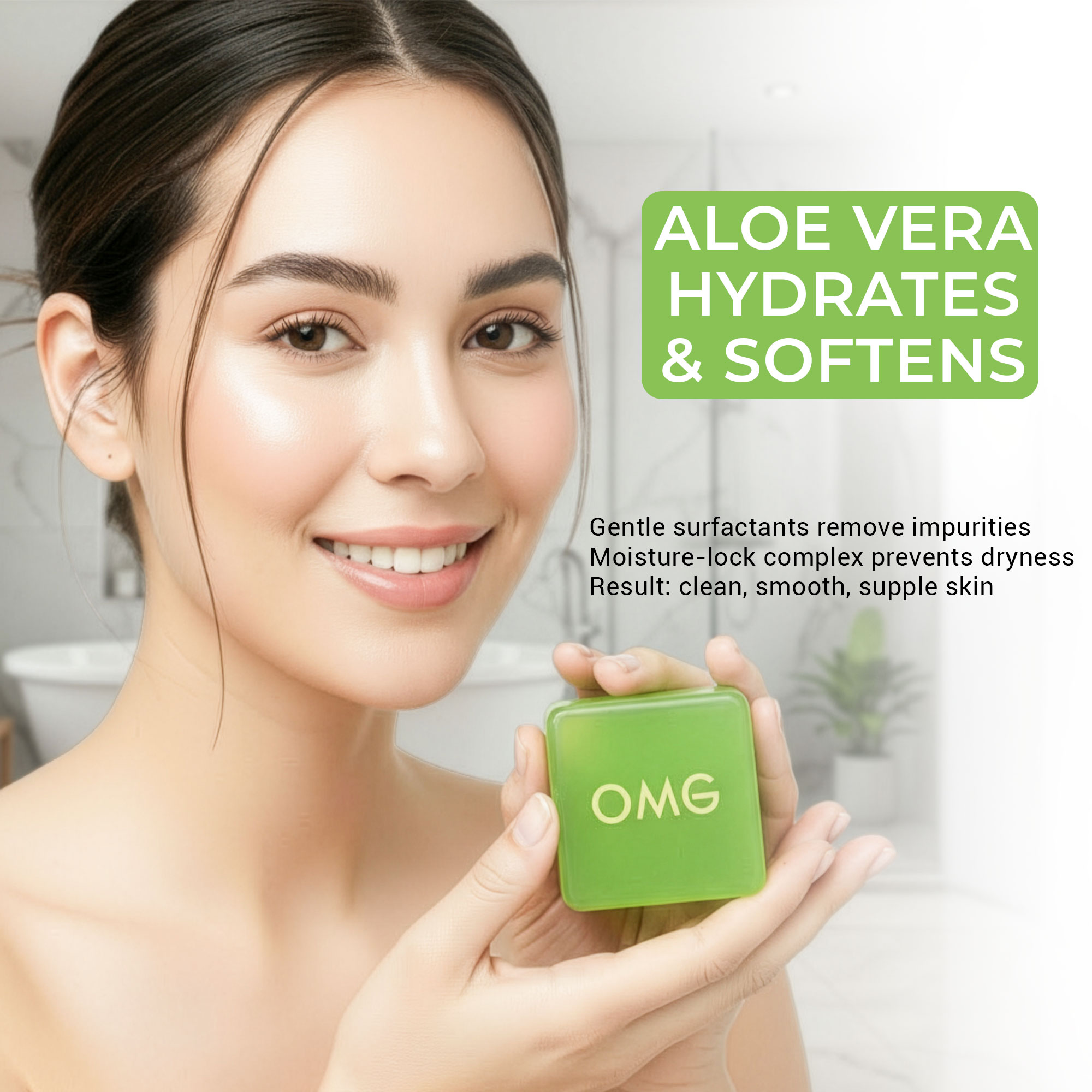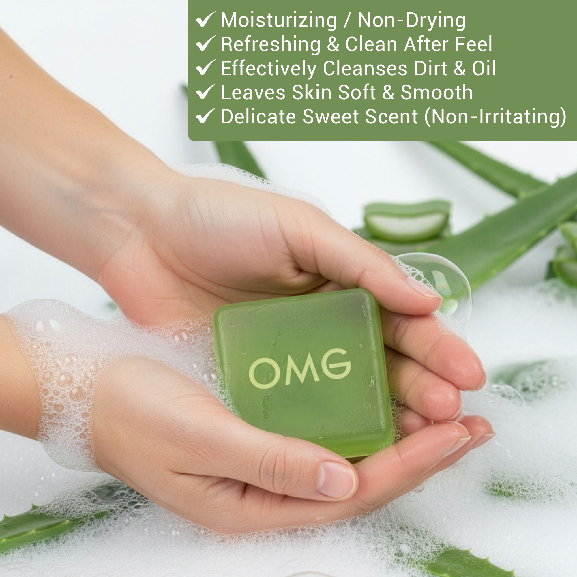 OMG Aloe Vera Facial Soap gently cleanses dirt and excess oil while keeping skin moisturized and refreshed. Enriched with Aloe Vera, Glycerin, and Sorbitol, it leaves skin soft, smooth, and comfortable after every wash. Suitable for daily use on dry to normal skin.